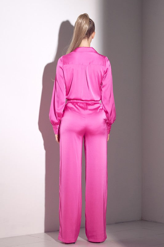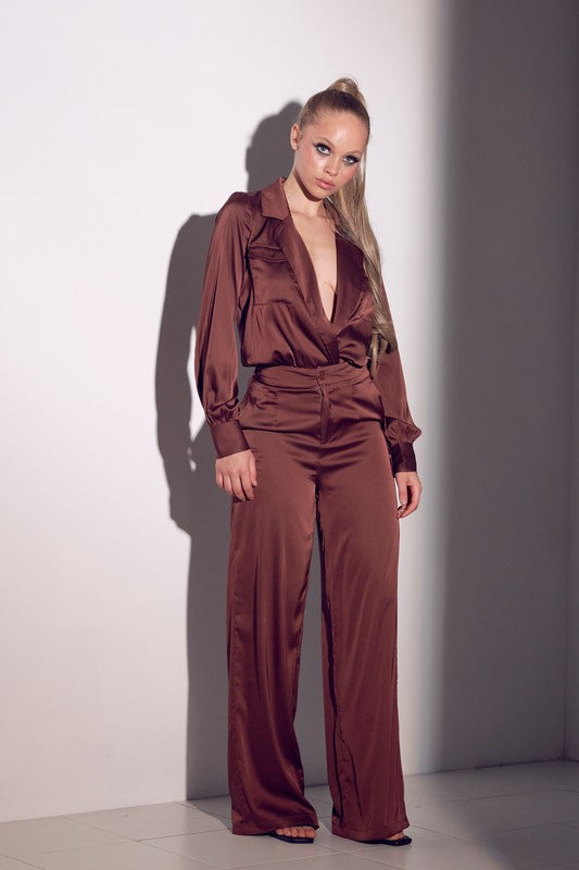 Our Dynamic Duo set offers a timeless look with modern sensibility. Crafted from luxe semi-stretch satin, this set features a classically styled bodysuit top with low v-neckline and cuffed sleeves, paired with a high-waisted pant with side pockets and an elasticized back band. Perfect for special occasions, or for adding a touch of sophistication to any day.