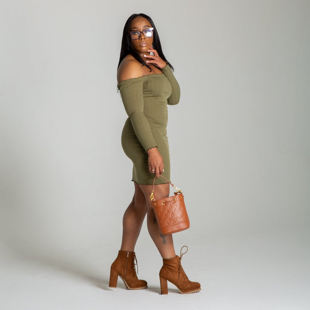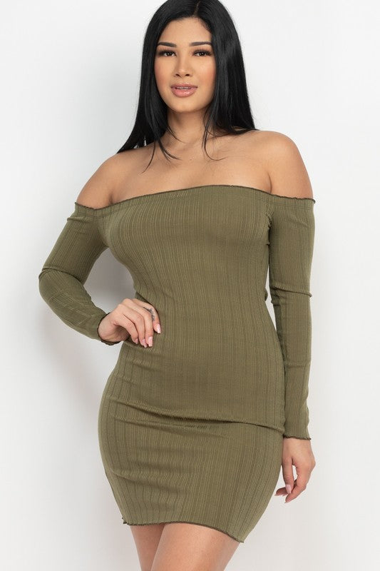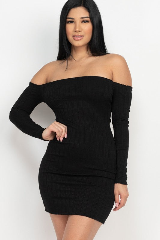 - Off shoulder lettuce edge bodycon dress - Soft rib knit - Fitted - Long sleeves - 95% Polyester 5% Spandex - Imported