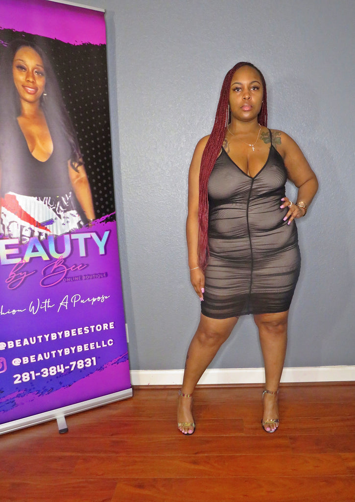 Sexy bodycon mesh dress with contrast lining. Dress features deep v neck, spaghetti strap, and ruched detail. FABRIC IS VERY STRETCHY.