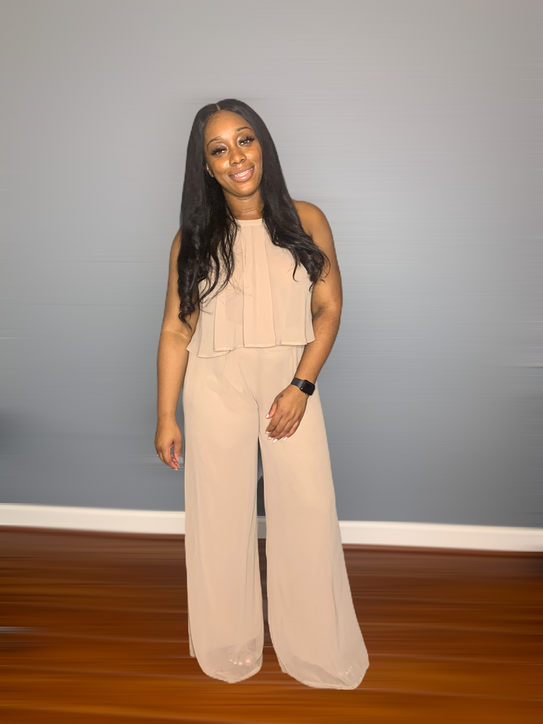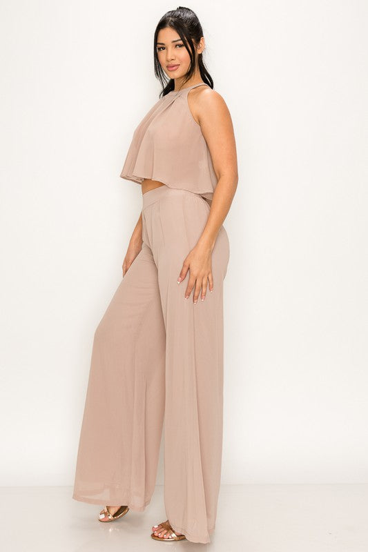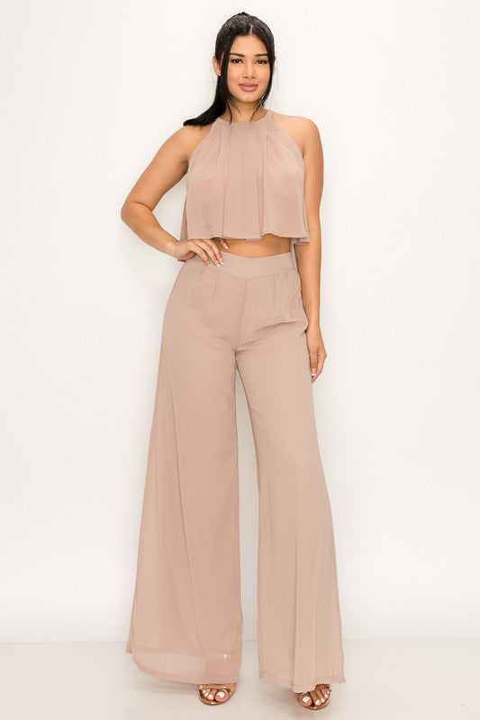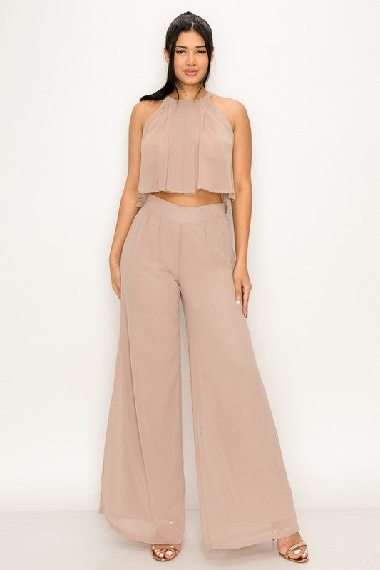 This Olivia Set features a pleated cropped top and pants, with a sleeveless design. The set is solid in color, with a cropped length top and a hi-lo and draped hem line. Additionally, there is intricate pleated detailing throughout the set, and the pants are full length and have a wide palazzo style.